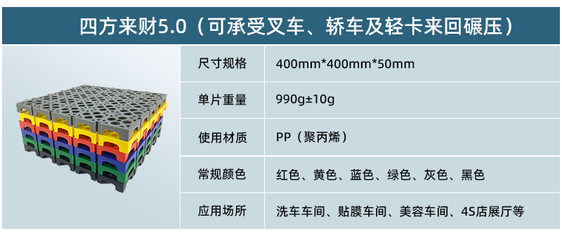 1. 分為3.4.5.厚度,解決不同厚度,統(tǒng)一紋路的問(wèn)題 2. 啞光平紋設(shè)計(jì),防滑,美觀,易清潔 3. 選用高級(jí)原料,加入其他輔料,顏色亮麗,無(wú)異味,無(wú)污染 4. 顏色為紅黃藍(lán)綠黑灰六色,滿足客戶用色需求,搭配屬于自己的風(fēng)格 5. 通扣鎖扣設(shè)計(jì),容易鋪設(shè)且容易拆卸打理 6. 加強(qiáng)支撐,不容易出現(xiàn)壓壞壓斷現(xiàn)象,滿足大多數(shù)車(chē)輛施工的要求 7. 使用年限長(zhǎng),五年超長(zhǎng)質(zhì)保,使用無(wú)后顧之憂 8. 十字支撐,保證承載最大化的同時(shí),且易排泥排水
