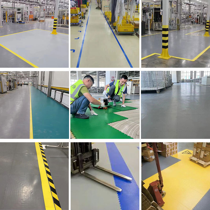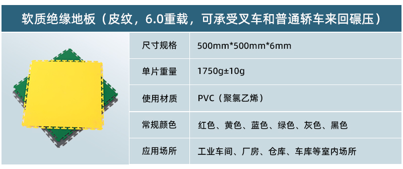 軟質絕緣地板能夠將每個獨立的地板快速拼裝成整體地面,專利型鎖扣結構連接能力更強,可承受叉車的來回碾壓。施工過程中無需膠黏劑等材質,具有施工簡單快速、色彩絢麗、美觀大方、可移動性強、可重復使用等特點。