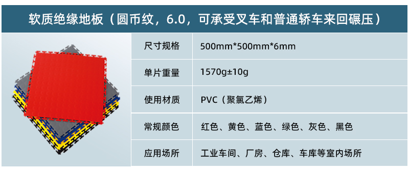軟質(zhì)絕緣地板采用純新軟性PVC(聚氯乙烯)生產(chǎn)而成,具有防滑、防油、靜音、抗沖擊、高承載等特點,可以快捷安裝在任何現(xiàn)有的基板,包括木材,混凝土,環(huán)氧樹脂,瓷磚,水磨石等,廣泛應(yīng)用于車間廠房地面、倉庫地面、車庫地面、健身房、展廳等場所。