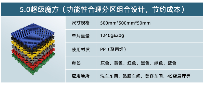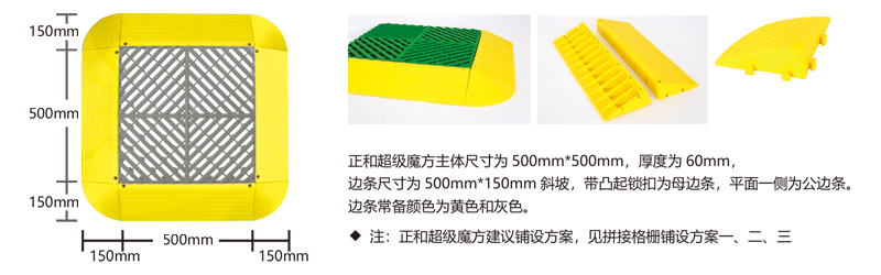 超級魔方產(chǎn)品綜合了以前產(chǎn)品的所有優(yōu)點(diǎn),包括結(jié)構(gòu)設(shè)計(jì)、防滑紋路、尺寸間距、加大鎖扣、矩陣支撐等,將產(chǎn)品厚度提升到60毫米的超高厚度,真正的實(shí)現(xiàn)了汽車店鋪的免挖溝鋪設(shè)。