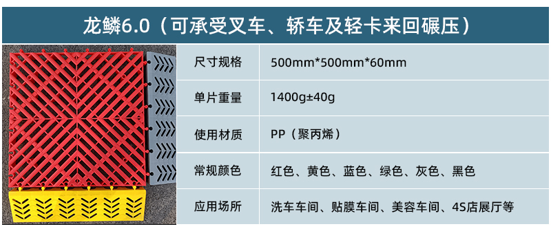 1.龍鱗紋設(shè)計(jì),防滑,美觀,寓意好 2.選用高級原料,加入其他輔料,顏色亮麗,無異味,無污染 3.顏色為紅黃藍(lán)綠黑灰六色,滿足客戶用色需求,搭配屬于自己的風(fēng)格 4.通扣鎖扣設(shè)計(jì),容易鋪設(shè)且容易拆卸打理 5.加強(qiáng)支撐,不容易出現(xiàn)壓壞壓斷現(xiàn)象,滿足大多數(shù)車輛施工的要求 6.使用年限長,3年超長質(zhì)保,使用無后顧之憂 7.不同厚度,采用不同支撐,保證承載最大化的同時(shí),且易排泥排水